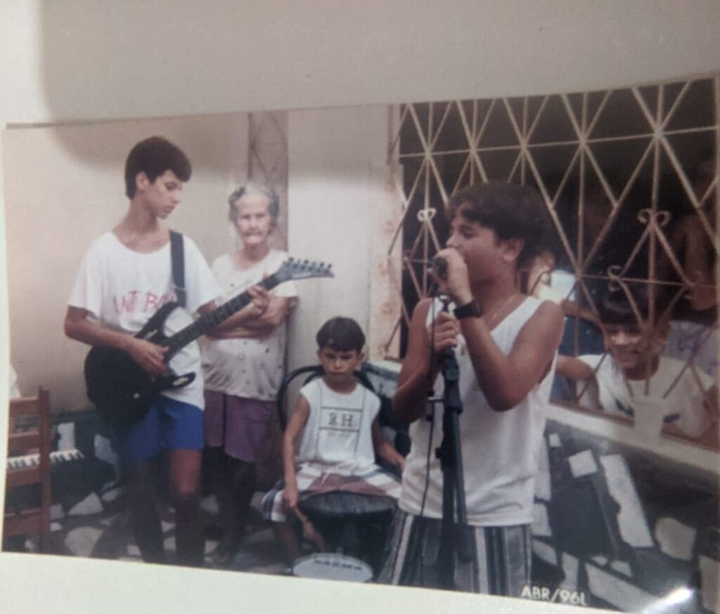 Deixando a parte familiar um pouco de lado, falarei da minha iniciação na música. Aos cinco anos, já gostava de brincar de baterista. Quebrava as cadeiras de madeira da casa, rasgava o sofá. Até que tive uma brilhante ideia de simular uma bateria improvisada com os instrumentos de percussão que meu pai tinha em casa. Todo final de semana, a família se reunia para fazer churrasco, e sempre tinha um samba raiz para “alegrar” a festa.